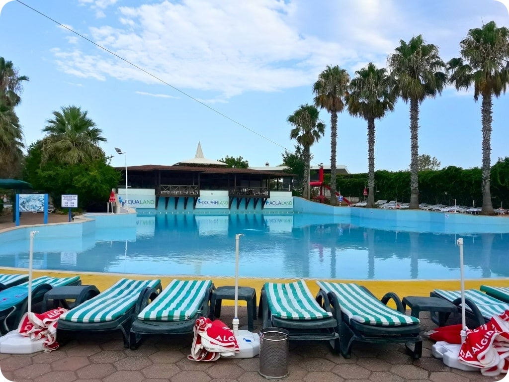 All pools are regularly filtered, and chlorine levels are checked. Children’s pools are cleaned frequently.